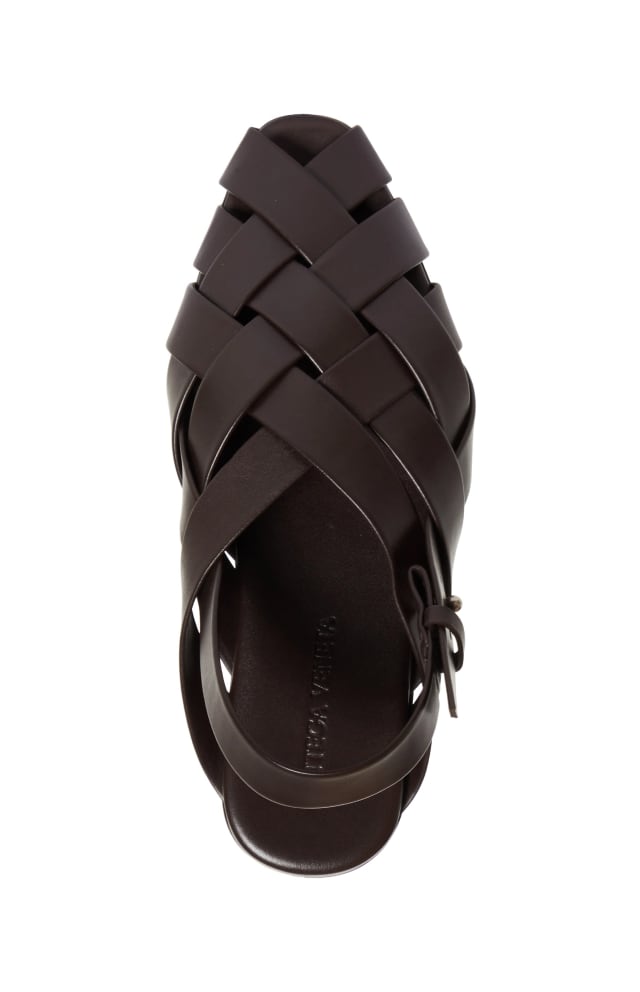 The label’s signature intrecciato weave brings texture, along with a stretchy fit, to a calfskin-leather slingback grounded by an articulated rubber sole.